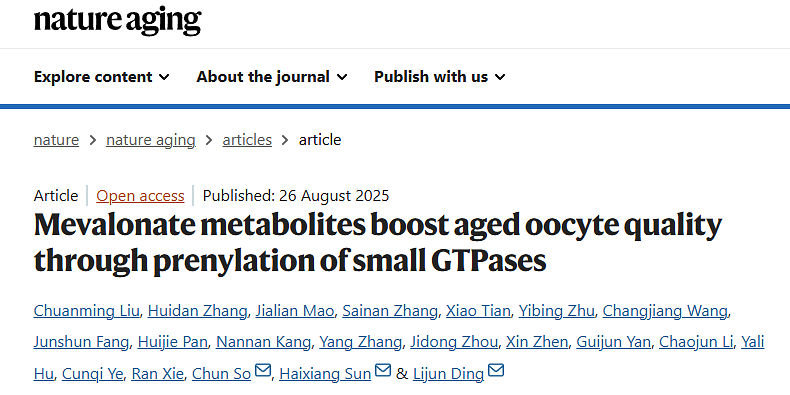 随着年龄的增长,女性的生育能力会逐渐下降,这已成为影响女性生殖健康的重要社会与医学问题。在这一过程中,卵母细胞质量的显著衰退是导致生育力降低的关键原因之一。然而,尽管卵巢衰老的临床需求日益迫切,目前临床上仍缺乏能够有效改善高龄女性卵母细胞质量的安全、针对性干预手段。2025年8月26日,来自南京大学医学院附属鼓楼医院的丁利军研究员、孙海翔教授与北京生命科学研究所的苏俊教授作为共同通讯作者,在《Nature Aging》(影响因子19.4)在线发表了题为“Mevalonate metabolites boost aged oocyte quality through prenylation of small GTPases”的突破性研究成果。该研究系统揭示了甲羟戊酸(mevalonate, MVA)代谢通路在卵母细胞衰老中的关键作用,并提出了通过代谢干预改善卵母细胞质量的新策略。