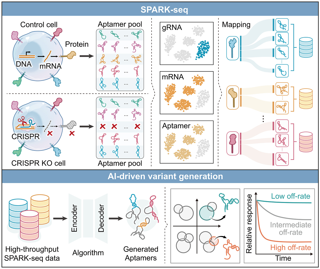细胞质膜表面蛋白是细胞与外界环境进行信息交换的关键物理界面,承载了约60%的已上市药物靶点,具有极高的临床转化潜力。然而,针对此类靶点开发高亲和力、高特异性的分子探针(如核酸适体)仍面临严峻挑战。传统的质谱分析或基于细胞的适体筛选方法多依赖于体外纯化蛋白或混合细胞群体,不仅筛选通量有限、周期冗长,也难以维持膜蛋白在脂质双层环境中的天然构象。这种“离体”筛选条件往往导致获得的探针在真实生理环境中出现亲和力下降或特异性丧失的问题,尤其制约了对低丰度、构象敏感型细胞表面标志物的系统性发现与靶向研究。针对长期制约精准医学发展的这一技术瓶颈,中国科学院杭州医学研究所谭蔚泓院士与吴芩研究员团队于2026年1月在 Science 上发表题为“SPARK-seq: a high-throughput platform for aptamer discovery and kinetic profiling”的研究论文,报道了一种全新的高通量适体发现与动力学解析平台——SPARK-seq。该技术突破了传统“盲筛”模式,首次在单细胞水平上将CRISPR基因编辑、单细胞转录组测序与大规模适体测序进行深度整合,实现对活细胞膜表面靶点的原位识别与定量分析。通过最大限度保留膜蛋白在生理状态下的天然构象,SPARK‑seq能确保筛选出的探针精准识别最具生物学意义的靶点真实构象。