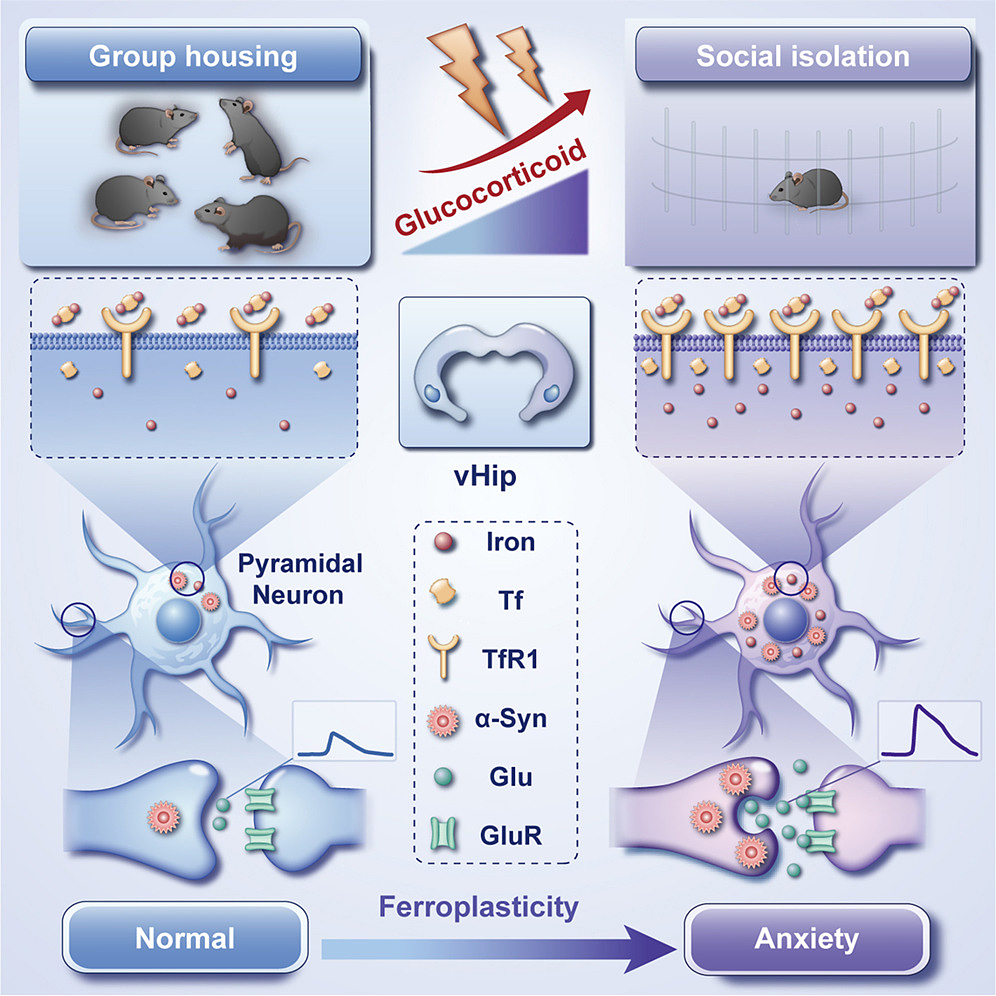 2026 年 1 月 27 日,浙江大学王福俤教授、闵军霞教授,华南理工大学王卓副教授,南方医科大学邱平明教授、南方医科大学第三附属医院吕田明副教授等在《Cell Metabolism》上发表题为 “Ferroplasticity drives social isolation-induced anxiety via a ventral hippocampal iron–α-synuclein axis”的研究论文。该研究揭示,社交隔离可在特定脑区诱导一种被命名为“铁可塑性”的全新分子生物学过程,进而驱动焦虑行为的发生。这一发现不仅首次从铁代谢与突触可塑性耦合的角度,阐明了孤独感向病理焦虑转化的关键机制,也为相关疾病的预防和干预提供了新靶点与新思路。